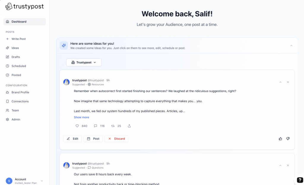 Good question! Most AI sounds pretty generic and robotic. Trustypost actually learns how you write and what your audience cares about. So the posts it creates feel like they came from you, not a robot.
